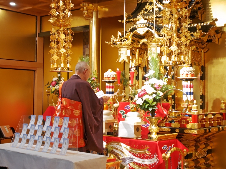 ご本堂にて故人様のお名前短冊をお飾りし、お読み上げいたしました