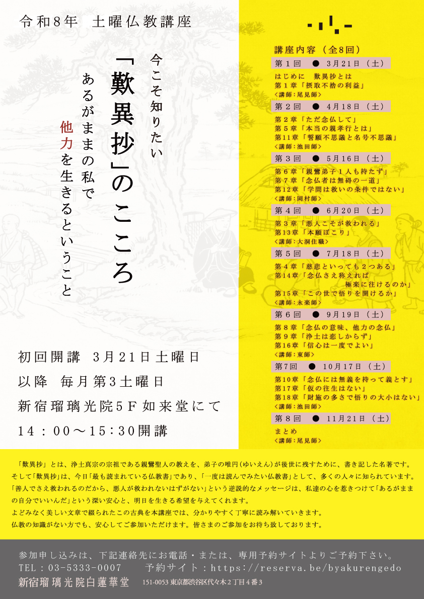 新規開催「令和8年 土曜仏教講座 今こそ知りたい「歎異抄」のこころ -あるがままの私で他力を生きるということ-